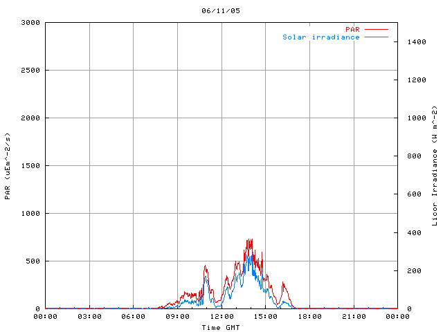 The PML meteorological station, situated on the south-west corner of the building roof, consists of a Hygroclip S3 temperature and humidity sensor housed in a radiation shield, a Mierij Meteo solid state wind sensor (MMW-005), a Chelsea instruments half-hemisphere PAR sensor, a Li-Cor pyranometer (LI-200SZ) and an Omni Instruments 6" tipping bucket raingauge (RG200). The data are logged every 5 minutes using a Pace Scientific XR5 data logger. The real-time rainfall data is likely in error - the correct values will be displayed after a time lag of approximately 24 hours. The meteorological station is sheltered from winds in the north-east and underestimates winds from this quarter. To use these data please contact Dr Tim Smyth.