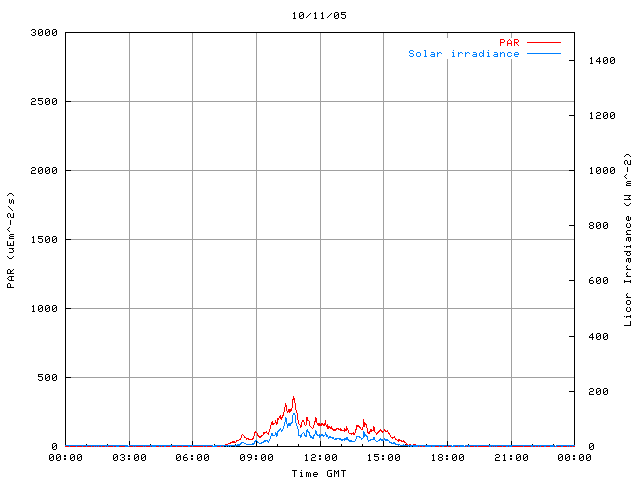 The PML meteorological station, situated on the south-west corner of the building roof, consists of a Hygroclip S3 temperature and humidity sensor housed in a radiation shield, a Mierij Meteo solid state wind sensor (MMW-005), a Chelsea instruments half-hemisphere PAR sensor, a Li-Cor pyranometer (LI-200SZ) and an Omni Instruments 6" tipping bucket raingauge (RG200). The data are logged every 5 minutes using a Pace Scientific XR5 data logger. The real-time rainfall data is likely in error - the correct values will be displayed after a time lag of approximately 24 hours. The meteorological station is sheltered from winds in the north-east and underestimates winds from this quarter. To use these data please contact Dr Tim Smyth.