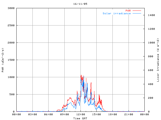 The PML meteorological station, situated on the south-west corner of the building roof, consists of a Hygroclip S3 temperature and humidity sensor housed in a radiation shield, a Mierij Meteo solid state wind sensor (MMW-005), a Chelsea instruments half-hemisphere PAR sensor, a Li-Cor pyranometer (LI-200SZ) and an Omni Instruments 6" tipping bucket raingauge (RG200). The data are logged every 5 minutes using a Pace Scientific XR5 data logger. The real-time rainfall data is likely in error - the correct values will be displayed after a time lag of approximately 24 hours. The meteorological station is sheltered from winds in the north-east and underestimates winds from this quarter. To use these data please contact Dr Tim Smyth.