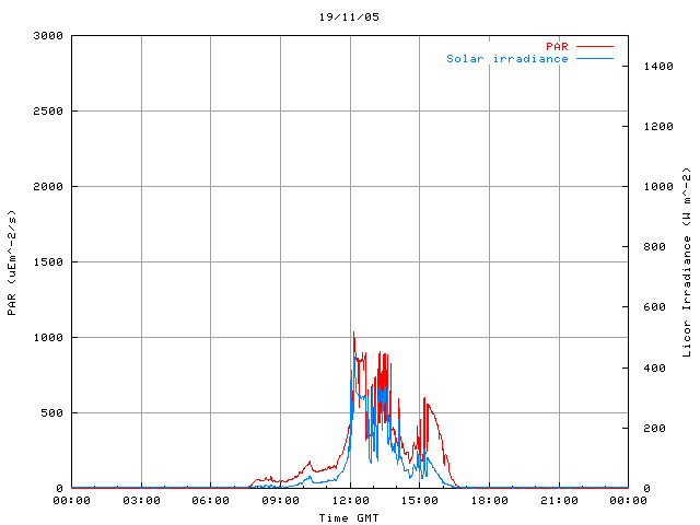 The PML meteorological station, situated on the south-west corner of the building roof, consists of a Hygroclip S3 temperature and humidity sensor housed in a radiation shield, a Mierij Meteo solid state wind sensor (MMW-005), a Chelsea instruments half-hemisphere PAR sensor, a Li-Cor pyranometer (LI-200SZ) and an Omni Instruments 6" tipping bucket raingauge (RG200). The data are logged every 5 minutes using a Pace Scientific XR5 data logger. The real-time rainfall data is likely in error - the correct values will be displayed after a time lag of approximately 24 hours. The meteorological station is sheltered from winds in the north-east and underestimates winds from this quarter. To use these data please contact Dr Tim Smyth.