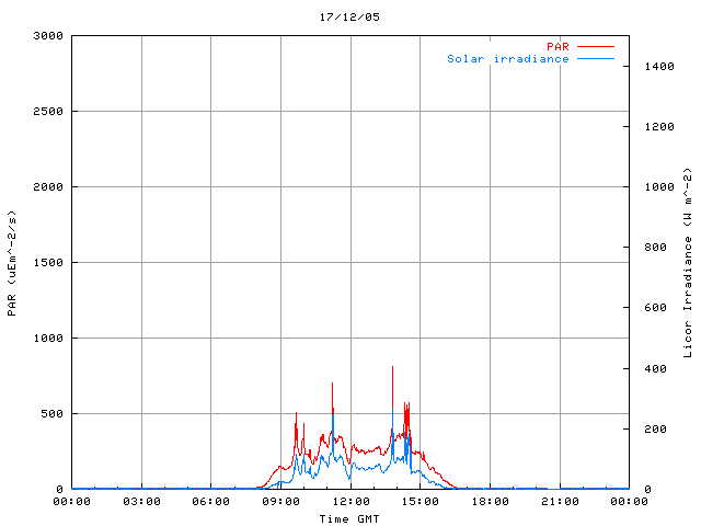 The PML meteorological station, situated on the south-west corner of the building roof, consists of a Hygroclip S3 temperature and humidity sensor housed in a radiation shield, a Mierij Meteo solid state wind sensor (MMW-005), a Chelsea instruments half-hemisphere PAR sensor, a Li-Cor pyranometer (LI-200SZ) and an Omni Instruments 6" tipping bucket raingauge (RG200). The data are logged every 5 minutes using a Pace Scientific XR5 data logger. The real-time rainfall data is likely in error - the correct values will be displayed after a time lag of approximately 24 hours. The meteorological station is sheltered from winds in the north-east and underestimates winds from this quarter. To use these data please contact Dr Tim Smyth.