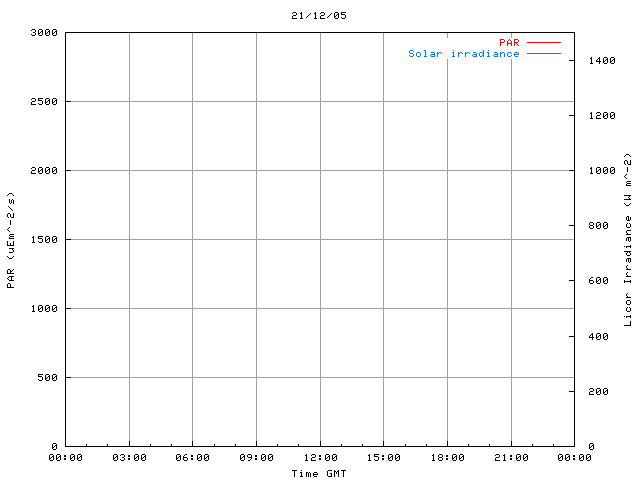 The PML meteorological station, situated on the south-west corner of the building roof, consists of a Hygroclip S3 temperature and humidity sensor housed in a radiation shield, a Mierij Meteo solid state wind sensor (MMW-005), a Chelsea instruments half-hemisphere PAR sensor, a Li-Cor pyranometer (LI-200SZ) and an Omni Instruments 6" tipping bucket raingauge (RG200). The data are logged every 5 minutes using a Pace Scientific XR5 data logger. The real-time rainfall data is likely in error - the correct values will be displayed after a time lag of approximately 24 hours. The meteorological station is sheltered from winds in the north-east and underestimates winds from this quarter. To use these data please contact Dr Tim Smyth.