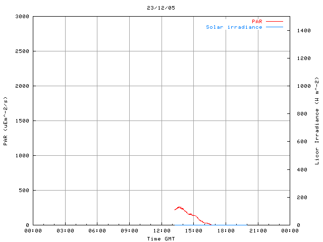 The PML meteorological station, situated on the south-west corner of the building roof, consists of a Hygroclip S3 temperature and humidity sensor housed in a radiation shield, a Mierij Meteo solid state wind sensor (MMW-005), a Chelsea instruments half-hemisphere PAR sensor, a Li-Cor pyranometer (LI-200SZ) and an Omni Instruments 6" tipping bucket raingauge (RG200). The data are logged every 5 minutes using a Pace Scientific XR5 data logger. The real-time rainfall data is likely in error - the correct values will be displayed after a time lag of approximately 24 hours. The meteorological station is sheltered from winds in the north-east and underestimates winds from this quarter. To use these data please contact Dr Tim Smyth.