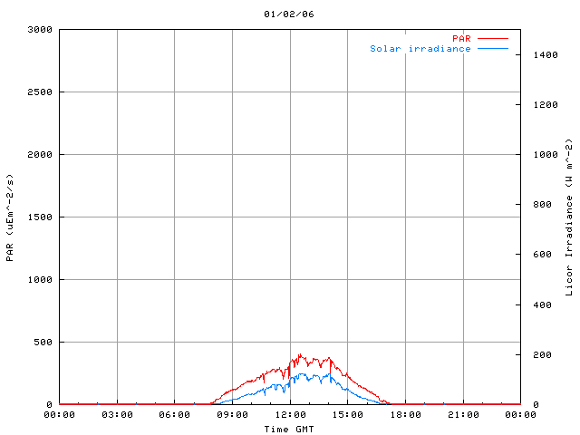 The PML meteorological station, situated on the south-west corner of the building roof, consists of a Hygroclip S3 temperature and humidity sensor housed in a radiation shield, a Mierij Meteo solid state wind sensor (MMW-005), a Chelsea instruments half-hemisphere PAR sensor, a Li-Cor pyranometer (LI-200SZ) and an Omni Instruments 6" tipping bucket raingauge (RG200). The data are logged every 5 minutes using a Pace Scientific XR5 data logger. The real-time rainfall data is likely in error - the correct values will be displayed after a time lag of approximately 24 hours. The meteorological station is sheltered from winds in the north-east and underestimates winds from this quarter. To use these data please contact Dr Tim Smyth.