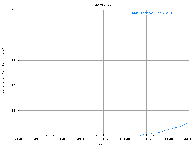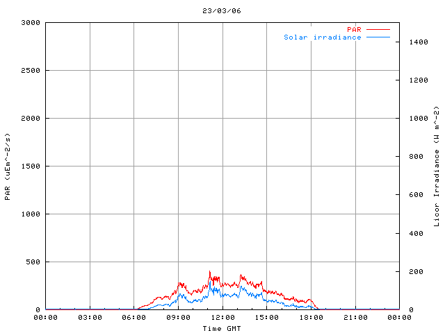 The PML meteorological station, situated on the south-west corner of the building roof, consists of a Hygroclip S3 temperature and humidity sensor housed in a radiation shield, a Mierij Meteo solid state wind sensor (MMW-005), a Chelsea instruments half-hemisphere PAR sensor, a Li-Cor pyranometer (LI-200SZ) and an Omni Instruments 6" tipping bucket raingauge (RG200). The data are logged every 5 minutes using a Pace Scientific XR5 data logger. The real-time rainfall data is likely in error - the correct values will be displayed after a time lag of approximately 24 hours. The meteorological station is sheltered from winds in the north-east and underestimates winds from this quarter. To use these data please contact Dr Tim Smyth.