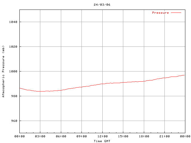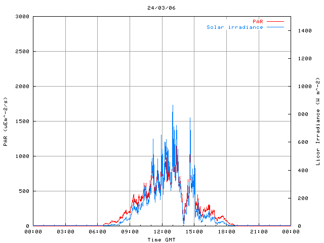 The PML meteorological station, situated on the south-west corner of the building roof, consists of a Hygroclip S3 temperature and humidity sensor housed in a radiation shield, a Mierij Meteo solid state wind sensor (MMW-005), a Chelsea instruments half-hemisphere PAR sensor, a Li-Cor pyranometer (LI-200SZ) and an Omni Instruments 6" tipping bucket raingauge (RG200). The data are logged every 5 minutes using a Pace Scientific XR5 data logger. The real-time rainfall data is likely in error - the correct values will be displayed after a time lag of approximately 24 hours. The meteorological station is sheltered from winds in the north-east and underestimates winds from this quarter. To use these data please contact Dr Tim Smyth.