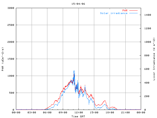 The PML meteorological station, situated on the south-west corner of the building roof, consists of a Hygroclip S3 temperature and humidity sensor housed in a radiation shield, a Mierij Meteo solid state wind sensor (MMW-005), a Chelsea instruments half-hemisphere PAR sensor, a Li-Cor pyranometer (LI-200SZ) and an Omni Instruments 6" tipping bucket raingauge (RG200). The data are logged every 5 minutes using a Pace Scientific XR5 data logger. The real-time rainfall data is likely in error - the correct values will be displayed after a time lag of approximately 24 hours. The meteorological station is sheltered from winds in the north-east and underestimates winds from this quarter. To use these data please contact Dr Tim Smyth.