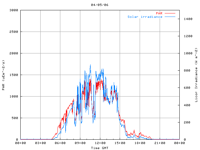 The PML meteorological station, situated on the south-west corner of the building roof, consists of a Hygroclip S3 temperature and humidity sensor housed in a radiation shield, a Mierij Meteo solid state wind sensor (MMW-005), a Chelsea instruments half-hemisphere PAR sensor, a Li-Cor pyranometer (LI-200SZ) and an Omni Instruments 6" tipping bucket raingauge (RG200). The data are logged every 5 minutes using a Pace Scientific XR5 data logger. The real-time rainfall data is likely in error - the correct values will be displayed after a time lag of approximately 24 hours. The meteorological station is sheltered from winds in the north-east and underestimates winds from this quarter. To use these data please contact Dr Tim Smyth.
