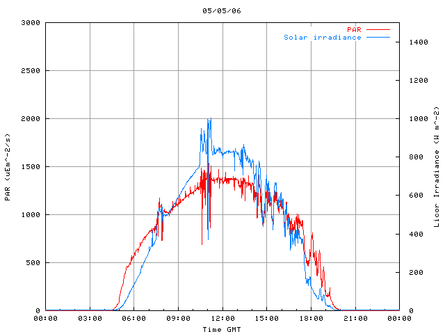 The PML meteorological station, situated on the south-west corner of the building roof, consists of a Hygroclip S3 temperature and humidity sensor housed in a radiation shield, a Mierij Meteo solid state wind sensor (MMW-005), a Chelsea instruments half-hemisphere PAR sensor, a Li-Cor pyranometer (LI-200SZ) and an Omni Instruments 6" tipping bucket raingauge (RG200). The data are logged every 5 minutes using a Pace Scientific XR5 data logger. The real-time rainfall data is likely in error - the correct values will be displayed after a time lag of approximately 24 hours. The meteorological station is sheltered from winds in the north-east and underestimates winds from this quarter. To use these data please contact Dr Tim Smyth.