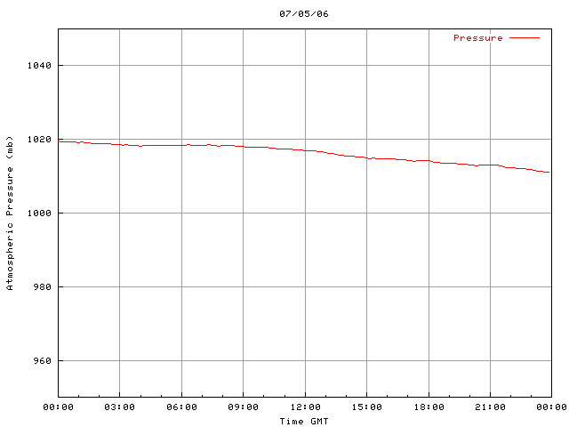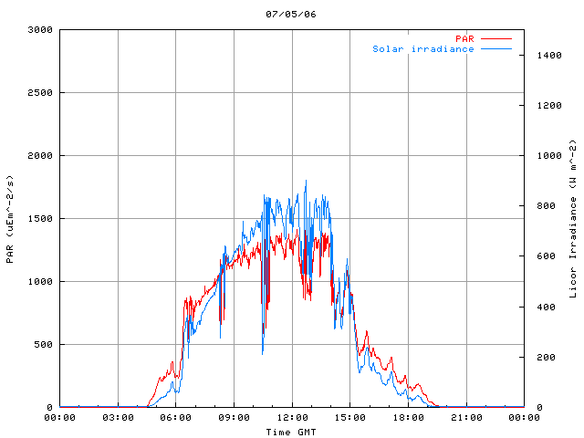 The PML meteorological station, situated on the south-west corner of the building roof, consists of a Hygroclip S3 temperature and humidity sensor housed in a radiation shield, a Mierij Meteo solid state wind sensor (MMW-005), a Chelsea instruments half-hemisphere PAR sensor, a Li-Cor pyranometer (LI-200SZ) and an Omni Instruments 6" tipping bucket raingauge (RG200). The data are logged every 5 minutes using a Pace Scientific XR5 data logger. The real-time rainfall data is likely in error - the correct values will be displayed after a time lag of approximately 24 hours. The meteorological station is sheltered from winds in the north-east and underestimates winds from this quarter. To use these data please contact Dr Tim Smyth.