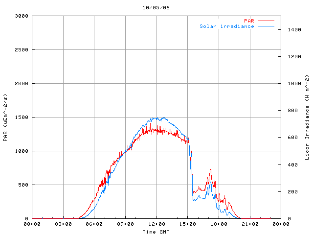 The PML meteorological station, situated on the south-west corner of the building roof, consists of a Hygroclip S3 temperature and humidity sensor housed in a radiation shield, a Mierij Meteo solid state wind sensor (MMW-005), a Chelsea instruments half-hemisphere PAR sensor, a Li-Cor pyranometer (LI-200SZ) and an Omni Instruments 6" tipping bucket raingauge (RG200). The data are logged every 5 minutes using a Pace Scientific XR5 data logger. The real-time rainfall data is likely in error - the correct values will be displayed after a time lag of approximately 24 hours. The meteorological station is sheltered from winds in the north-east and underestimates winds from this quarter. To use these data please contact Dr Tim Smyth.