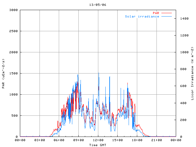 The PML meteorological station, situated on the south-west corner of the building roof, consists of a Hygroclip S3 temperature and humidity sensor housed in a radiation shield, a Mierij Meteo solid state wind sensor (MMW-005), a Chelsea instruments half-hemisphere PAR sensor, a Li-Cor pyranometer (LI-200SZ) and an Omni Instruments 6" tipping bucket raingauge (RG200). The data are logged every 5 minutes using a Pace Scientific XR5 data logger. The real-time rainfall data is likely in error - the correct values will be displayed after a time lag of approximately 24 hours. The meteorological station is sheltered from winds in the north-east and underestimates winds from this quarter. To use these data please contact Dr Tim Smyth.