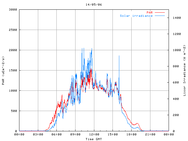 The PML meteorological station, situated on the south-west corner of the building roof, consists of a Hygroclip S3 temperature and humidity sensor housed in a radiation shield, a Mierij Meteo solid state wind sensor (MMW-005), a Chelsea instruments half-hemisphere PAR sensor, a Li-Cor pyranometer (LI-200SZ) and an Omni Instruments 6" tipping bucket raingauge (RG200). The data are logged every 5 minutes using a Pace Scientific XR5 data logger. The real-time rainfall data is likely in error - the correct values will be displayed after a time lag of approximately 24 hours. The meteorological station is sheltered from winds in the north-east and underestimates winds from this quarter. To use these data please contact Dr Tim Smyth.