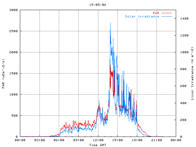 The PML meteorological station, situated on the south-west corner of the building roof, consists of a Hygroclip S3 temperature and humidity sensor housed in a radiation shield, a Mierij Meteo solid state wind sensor (MMW-005), a Chelsea instruments half-hemisphere PAR sensor, a Li-Cor pyranometer (LI-200SZ) and an Omni Instruments 6" tipping bucket raingauge (RG200). The data are logged every 5 minutes using a Pace Scientific XR5 data logger. The real-time rainfall data is likely in error - the correct values will be displayed after a time lag of approximately 24 hours. The meteorological station is sheltered from winds in the north-east and underestimates winds from this quarter. To use these data please contact Dr Tim Smyth.