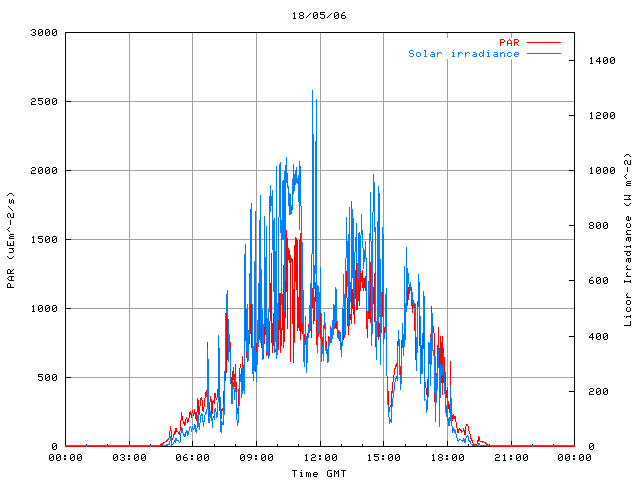 The PML meteorological station, situated on the south-west corner of the building roof, consists of a Hygroclip S3 temperature and humidity sensor housed in a radiation shield, a Mierij Meteo solid state wind sensor (MMW-005), a Chelsea instruments half-hemisphere PAR sensor, a Li-Cor pyranometer (LI-200SZ) and an Omni Instruments 6" tipping bucket raingauge (RG200). The data are logged every 5 minutes using a Pace Scientific XR5 data logger. The real-time rainfall data is likely in error - the correct values will be displayed after a time lag of approximately 24 hours. The meteorological station is sheltered from winds in the north-east and underestimates winds from this quarter. To use these data please contact Dr Tim Smyth.