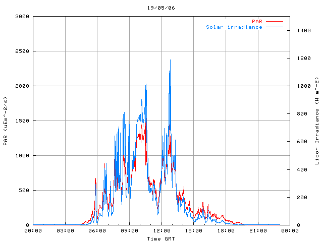 The PML meteorological station, situated on the south-west corner of the building roof, consists of a Hygroclip S3 temperature and humidity sensor housed in a radiation shield, a Mierij Meteo solid state wind sensor (MMW-005), a Chelsea instruments half-hemisphere PAR sensor, a Li-Cor pyranometer (LI-200SZ) and an Omni Instruments 6" tipping bucket raingauge (RG200). The data are logged every 5 minutes using a Pace Scientific XR5 data logger. The real-time rainfall data is likely in error - the correct values will be displayed after a time lag of approximately 24 hours. The meteorological station is sheltered from winds in the north-east and underestimates winds from this quarter. To use these data please contact Dr Tim Smyth.