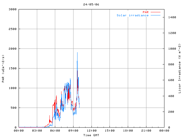 The PML meteorological station, situated on the south-west corner of the building roof, consists of a Hygroclip S3 temperature and humidity sensor housed in a radiation shield, a Mierij Meteo solid state wind sensor (MMW-005), a Chelsea instruments half-hemisphere PAR sensor, a Li-Cor pyranometer (LI-200SZ) and an Omni Instruments 6" tipping bucket raingauge (RG200). The data are logged every 5 minutes using a Pace Scientific XR5 data logger. The real-time rainfall data is likely in error - the correct values will be displayed after a time lag of approximately 24 hours. The meteorological station is sheltered from winds in the north-east and underestimates winds from this quarter. To use these data please contact Dr Tim Smyth.