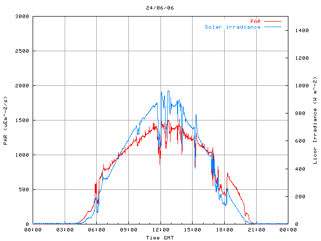 The PML meteorological station, situated on the south-west corner of the building roof, consists of a Hygroclip S3 temperature and humidity sensor housed in a radiation shield, a Mierij Meteo solid state wind sensor (MMW-005), a Chelsea instruments half-hemisphere PAR sensor, a Li-Cor pyranometer (LI-200SZ) and an Omni Instruments 6" tipping bucket raingauge (RG200). The data are logged every 5 minutes using a Pace Scientific XR5 data logger. The real-time rainfall data is likely in error - the correct values will be displayed after a time lag of approximately 24 hours. The meteorological station is sheltered from winds in the north-east and underestimates winds from this quarter. To use these data please contact Dr Tim Smyth.
