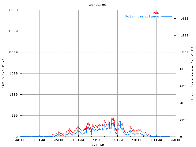 The PML meteorological station, situated on the south-west corner of the building roof, consists of a Hygroclip S3 temperature and humidity sensor housed in a radiation shield, a Mierij Meteo solid state wind sensor (MMW-005), a Chelsea instruments half-hemisphere PAR sensor, a Li-Cor pyranometer (LI-200SZ) and an Omni Instruments 6" tipping bucket raingauge (RG200). The data are logged every 5 minutes using a Pace Scientific XR5 data logger. The real-time rainfall data is likely in error - the correct values will be displayed after a time lag of approximately 24 hours. The meteorological station is sheltered from winds in the north-east and underestimates winds from this quarter. To use these data please contact Dr Tim Smyth.