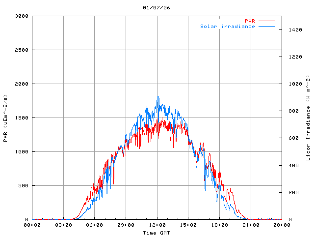 The PML meteorological station, situated on the south-west corner of the building roof, consists of a Hygroclip S3 temperature and humidity sensor housed in a radiation shield, a Mierij Meteo solid state wind sensor (MMW-005), a Chelsea instruments half-hemisphere PAR sensor, a Li-Cor pyranometer (LI-200SZ) and an Omni Instruments 6" tipping bucket raingauge (RG200). The data are logged every 5 minutes using a Pace Scientific XR5 data logger. The real-time rainfall data is likely in error - the correct values will be displayed after a time lag of approximately 24 hours. The meteorological station is sheltered from winds in the north-east and underestimates winds from this quarter. To use these data please contact Dr Tim Smyth.