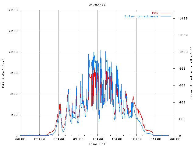 The PML meteorological station, situated on the south-west corner of the building roof, consists of a Hygroclip S3 temperature and humidity sensor housed in a radiation shield, a Mierij Meteo solid state wind sensor (MMW-005), a Chelsea instruments half-hemisphere PAR sensor, a Li-Cor pyranometer (LI-200SZ) and an Omni Instruments 6" tipping bucket raingauge (RG200). The data are logged every 5 minutes using a Pace Scientific XR5 data logger. The real-time rainfall data is likely in error - the correct values will be displayed after a time lag of approximately 24 hours. The meteorological station is sheltered from winds in the north-east and underestimates winds from this quarter. To use these data please contact Dr Tim Smyth.