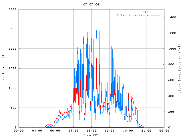 The PML meteorological station, situated on the south-west corner of the building roof, consists of a Hygroclip S3 temperature and humidity sensor housed in a radiation shield, a Mierij Meteo solid state wind sensor (MMW-005), a Chelsea instruments half-hemisphere PAR sensor, a Li-Cor pyranometer (LI-200SZ) and an Omni Instruments 6" tipping bucket raingauge (RG200). The data are logged every 5 minutes using a Pace Scientific XR5 data logger. The real-time rainfall data is likely in error - the correct values will be displayed after a time lag of approximately 24 hours. The meteorological station is sheltered from winds in the north-east and underestimates winds from this quarter. To use these data please contact Dr Tim Smyth.