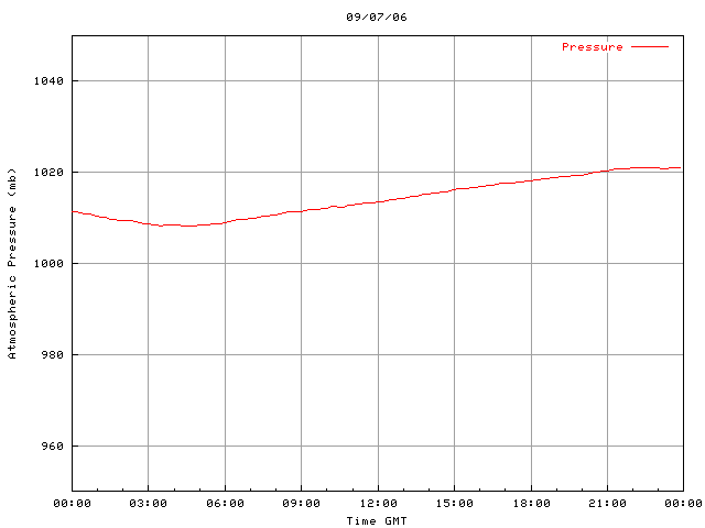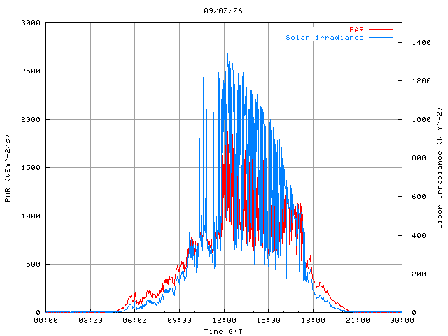 The PML meteorological station, situated on the south-west corner of the building roof, consists of a Hygroclip S3 temperature and humidity sensor housed in a radiation shield, a Mierij Meteo solid state wind sensor (MMW-005), a Chelsea instruments half-hemisphere PAR sensor, a Li-Cor pyranometer (LI-200SZ) and an Omni Instruments 6" tipping bucket raingauge (RG200). The data are logged every 5 minutes using a Pace Scientific XR5 data logger. The real-time rainfall data is likely in error - the correct values will be displayed after a time lag of approximately 24 hours. The meteorological station is sheltered from winds in the north-east and underestimates winds from this quarter. To use these data please contact Dr Tim Smyth.