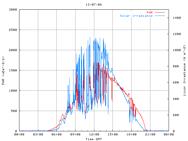 The PML meteorological station, situated on the south-west corner of the building roof, consists of a Hygroclip S3 temperature and humidity sensor housed in a radiation shield, a Mierij Meteo solid state wind sensor (MMW-005), a Chelsea instruments half-hemisphere PAR sensor, a Li-Cor pyranometer (LI-200SZ) and an Omni Instruments 6" tipping bucket raingauge (RG200). The data are logged every 5 minutes using a Pace Scientific XR5 data logger. The real-time rainfall data is likely in error - the correct values will be displayed after a time lag of approximately 24 hours. The meteorological station is sheltered from winds in the north-east and underestimates winds from this quarter. To use these data please contact Dr Tim Smyth.