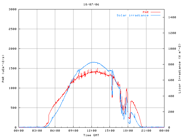 The PML meteorological station, situated on the south-west corner of the building roof, consists of a Hygroclip S3 temperature and humidity sensor housed in a radiation shield, a Mierij Meteo solid state wind sensor (MMW-005), a Chelsea instruments half-hemisphere PAR sensor, a Li-Cor pyranometer (LI-200SZ) and an Omni Instruments 6" tipping bucket raingauge (RG200). The data are logged every 5 minutes using a Pace Scientific XR5 data logger. The real-time rainfall data is likely in error - the correct values will be displayed after a time lag of approximately 24 hours. The meteorological station is sheltered from winds in the north-east and underestimates winds from this quarter. To use these data please contact Dr Tim Smyth.