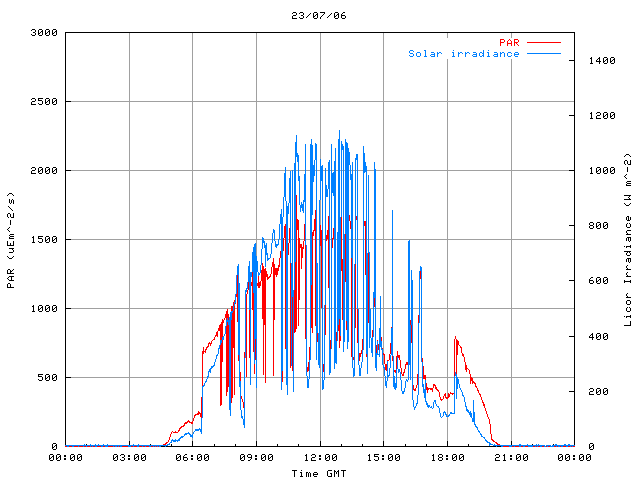The PML meteorological station, situated on the south-west corner of the building roof, consists of a Hygroclip S3 temperature and humidity sensor housed in a radiation shield, a Mierij Meteo solid state wind sensor (MMW-005), a Chelsea instruments half-hemisphere PAR sensor, a Li-Cor pyranometer (LI-200SZ) and an Omni Instruments 6" tipping bucket raingauge (RG200). The data are logged every 5 minutes using a Pace Scientific XR5 data logger. The real-time rainfall data is likely in error - the correct values will be displayed after a time lag of approximately 24 hours. The meteorological station is sheltered from winds in the north-east and underestimates winds from this quarter. To use these data please contact Dr Tim Smyth.