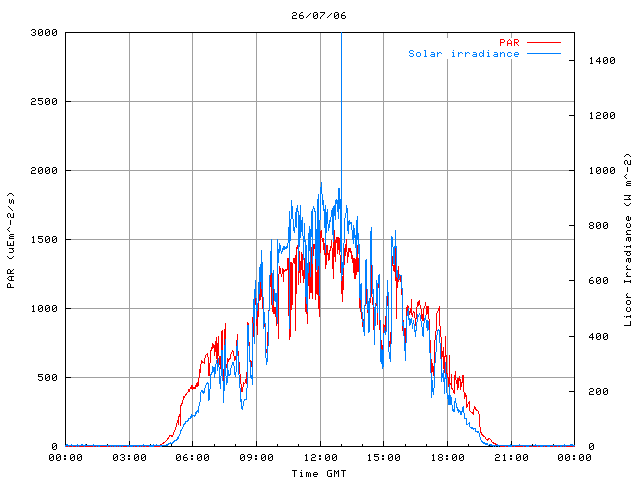 The PML meteorological station, situated on the south-west corner of the building roof, consists of a Hygroclip S3 temperature and humidity sensor housed in a radiation shield, a Mierij Meteo solid state wind sensor (MMW-005), a Chelsea instruments half-hemisphere PAR sensor, a Li-Cor pyranometer (LI-200SZ) and an Omni Instruments 6" tipping bucket raingauge (RG200). The data are logged every 5 minutes using a Pace Scientific XR5 data logger. The real-time rainfall data is likely in error - the correct values will be displayed after a time lag of approximately 24 hours. The meteorological station is sheltered from winds in the north-east and underestimates winds from this quarter. To use these data please contact Dr Tim Smyth.