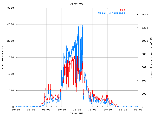 The PML meteorological station, situated on the south-west corner of the building roof, consists of a Hygroclip S3 temperature and humidity sensor housed in a radiation shield, a Mierij Meteo solid state wind sensor (MMW-005), a Chelsea instruments half-hemisphere PAR sensor, a Li-Cor pyranometer (LI-200SZ) and an Omni Instruments 6" tipping bucket raingauge (RG200). The data are logged every 5 minutes using a Pace Scientific XR5 data logger. The real-time rainfall data is likely in error - the correct values will be displayed after a time lag of approximately 24 hours. The meteorological station is sheltered from winds in the north-east and underestimates winds from this quarter. To use these data please contact Dr Tim Smyth.