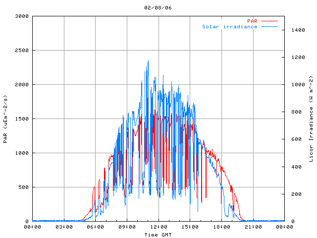 The PML meteorological station, situated on the south-west corner of the building roof, consists of a Hygroclip S3 temperature and humidity sensor housed in a radiation shield, a Mierij Meteo solid state wind sensor (MMW-005), a Chelsea instruments half-hemisphere PAR sensor, a Li-Cor pyranometer (LI-200SZ) and an Omni Instruments 6" tipping bucket raingauge (RG200). The data are logged every 5 minutes using a Pace Scientific XR5 data logger. The real-time rainfall data is likely in error - the correct values will be displayed after a time lag of approximately 24 hours. The meteorological station is sheltered from winds in the north-east and underestimates winds from this quarter. To use these data please contact Dr Tim Smyth.