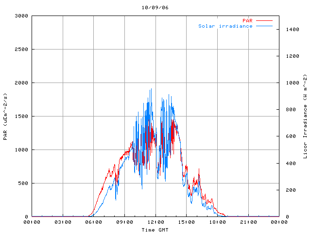 The PML meteorological station, situated on the south-west corner of the building roof, consists of a Hygroclip S3 temperature and humidity sensor housed in a radiation shield, a Mierij Meteo solid state wind sensor (MMW-005), a Chelsea instruments half-hemisphere PAR sensor, a Li-Cor pyranometer (LI-200SZ) and an Omni Instruments 6" tipping bucket raingauge (RG200). The data are logged every 5 minutes using a Pace Scientific XR5 data logger. The real-time rainfall data is likely in error - the correct values will be displayed after a time lag of approximately 24 hours. The meteorological station is sheltered from winds in the north-east and underestimates winds from this quarter. To use these data please contact Dr Tim Smyth.