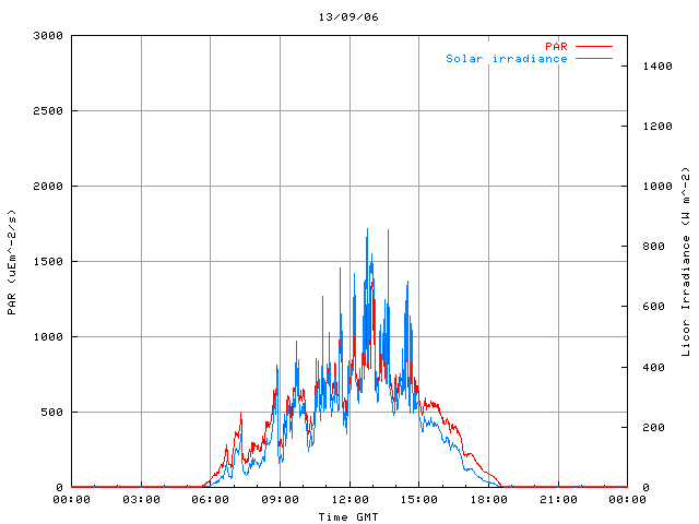 The PML meteorological station, situated on the south-west corner of the building roof, consists of a Hygroclip S3 temperature and humidity sensor housed in a radiation shield, a Mierij Meteo solid state wind sensor (MMW-005), a Chelsea instruments half-hemisphere PAR sensor, a Li-Cor pyranometer (LI-200SZ) and an Omni Instruments 6" tipping bucket raingauge (RG200). The data are logged every 5 minutes using a Pace Scientific XR5 data logger. The real-time rainfall data is likely in error - the correct values will be displayed after a time lag of approximately 24 hours. The meteorological station is sheltered from winds in the north-east and underestimates winds from this quarter. To use these data please contact Dr Tim Smyth.