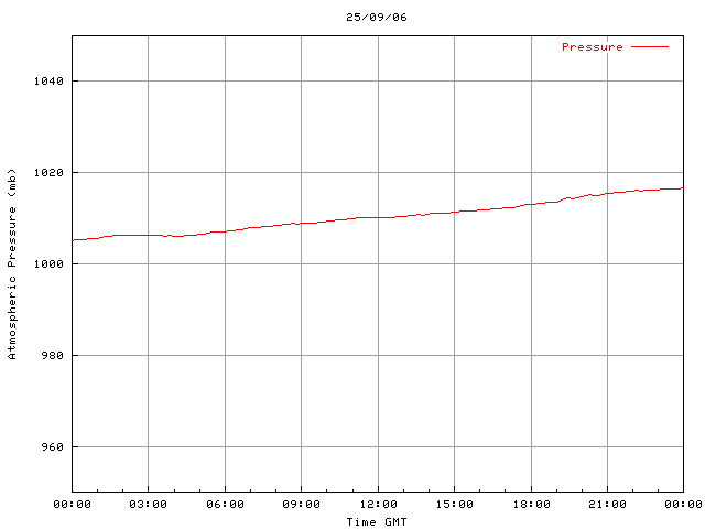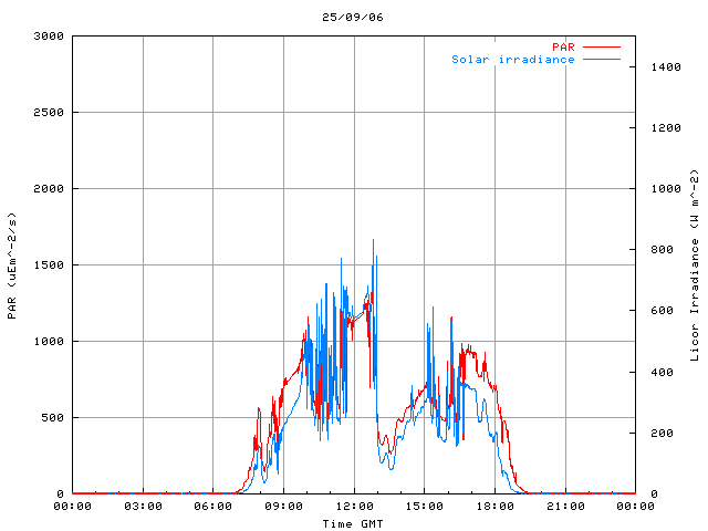 The PML meteorological station, situated on the south-west corner of the building roof, consists of a Hygroclip S3 temperature and humidity sensor housed in a radiation shield, a Mierij Meteo solid state wind sensor (MMW-005), a Chelsea instruments half-hemisphere PAR sensor, a Li-Cor pyranometer (LI-200SZ) and an Omni Instruments 6" tipping bucket raingauge (RG200). The data are logged every 5 minutes using a Pace Scientific XR5 data logger. The real-time rainfall data is likely in error - the correct values will be displayed after a time lag of approximately 24 hours. The meteorological station is sheltered from winds in the north-east and underestimates winds from this quarter. To use these data please contact Dr Tim Smyth.