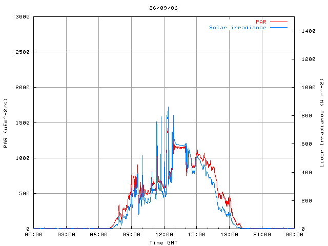 The PML meteorological station, situated on the south-west corner of the building roof, consists of a Hygroclip S3 temperature and humidity sensor housed in a radiation shield, a Mierij Meteo solid state wind sensor (MMW-005), a Chelsea instruments half-hemisphere PAR sensor, a Li-Cor pyranometer (LI-200SZ) and an Omni Instruments 6" tipping bucket raingauge (RG200). The data are logged every 5 minutes using a Pace Scientific XR5 data logger. The real-time rainfall data is likely in error - the correct values will be displayed after a time lag of approximately 24 hours. The meteorological station is sheltered from winds in the north-east and underestimates winds from this quarter. To use these data please contact Dr Tim Smyth.