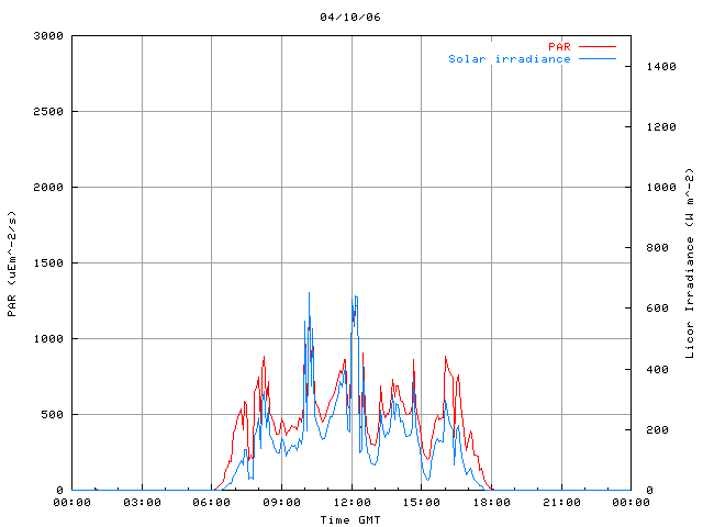 The PML meteorological station, situated on the south-west corner of the building roof, consists of a Hygroclip S3 temperature and humidity sensor housed in a radiation shield, a Mierij Meteo solid state wind sensor (MMW-005), a Chelsea instruments half-hemisphere PAR sensor, a Li-Cor pyranometer (LI-200SZ) and an Omni Instruments 6" tipping bucket raingauge (RG200). The data are logged every 5 minutes using a Pace Scientific XR5 data logger. The real-time rainfall data is likely in error - the correct values will be displayed after a time lag of approximately 24 hours. The meteorological station is sheltered from winds in the north-east and underestimates winds from this quarter. To use these data please contact Dr Tim Smyth.