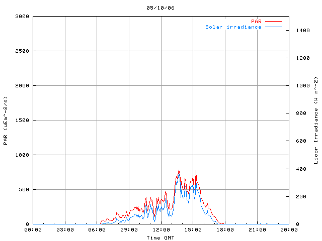 The PML meteorological station, situated on the south-west corner of the building roof, consists of a Hygroclip S3 temperature and humidity sensor housed in a radiation shield, a Mierij Meteo solid state wind sensor (MMW-005), a Chelsea instruments half-hemisphere PAR sensor, a Li-Cor pyranometer (LI-200SZ) and an Omni Instruments 6" tipping bucket raingauge (RG200). The data are logged every 5 minutes using a Pace Scientific XR5 data logger. The real-time rainfall data is likely in error - the correct values will be displayed after a time lag of approximately 24 hours. The meteorological station is sheltered from winds in the north-east and underestimates winds from this quarter. To use these data please contact Dr Tim Smyth.