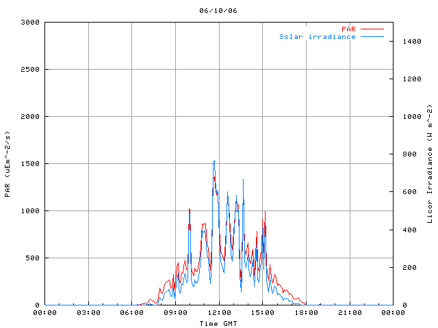 The PML meteorological station, situated on the south-west corner of the building roof, consists of a Hygroclip S3 temperature and humidity sensor housed in a radiation shield, a Mierij Meteo solid state wind sensor (MMW-005), a Chelsea instruments half-hemisphere PAR sensor, a Li-Cor pyranometer (LI-200SZ) and an Omni Instruments 6" tipping bucket raingauge (RG200). The data are logged every 5 minutes using a Pace Scientific XR5 data logger. The real-time rainfall data is likely in error - the correct values will be displayed after a time lag of approximately 24 hours. The meteorological station is sheltered from winds in the north-east and underestimates winds from this quarter. To use these data please contact Dr Tim Smyth.