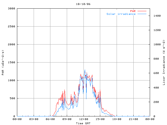 The PML meteorological station, situated on the south-west corner of the building roof, consists of a Hygroclip S3 temperature and humidity sensor housed in a radiation shield, a Mierij Meteo solid state wind sensor (MMW-005), a Chelsea instruments half-hemisphere PAR sensor, a Li-Cor pyranometer (LI-200SZ) and an Omni Instruments 6" tipping bucket raingauge (RG200). The data are logged every 5 minutes using a Pace Scientific XR5 data logger. The real-time rainfall data is likely in error - the correct values will be displayed after a time lag of approximately 24 hours. The meteorological station is sheltered from winds in the north-east and underestimates winds from this quarter. To use these data please contact Dr Tim Smyth.