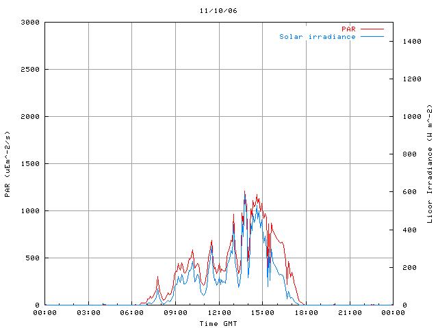 The PML meteorological station, situated on the south-west corner of the building roof, consists of a Hygroclip S3 temperature and humidity sensor housed in a radiation shield, a Mierij Meteo solid state wind sensor (MMW-005), a Chelsea instruments half-hemisphere PAR sensor, a Li-Cor pyranometer (LI-200SZ) and an Omni Instruments 6" tipping bucket raingauge (RG200). The data are logged every 5 minutes using a Pace Scientific XR5 data logger. The real-time rainfall data is likely in error - the correct values will be displayed after a time lag of approximately 24 hours. The meteorological station is sheltered from winds in the north-east and underestimates winds from this quarter. To use these data please contact Dr Tim Smyth.