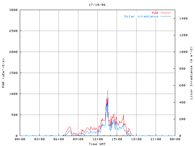 The PML meteorological station, situated on the south-west corner of the building roof, consists of a Hygroclip S3 temperature and humidity sensor housed in a radiation shield, a Mierij Meteo solid state wind sensor (MMW-005), a Chelsea instruments half-hemisphere PAR sensor, a Li-Cor pyranometer (LI-200SZ) and an Omni Instruments 6" tipping bucket raingauge (RG200). The data are logged every 5 minutes using a Pace Scientific XR5 data logger. The real-time rainfall data is likely in error - the correct values will be displayed after a time lag of approximately 24 hours. The meteorological station is sheltered from winds in the north-east and underestimates winds from this quarter. To use these data please contact Dr Tim Smyth.