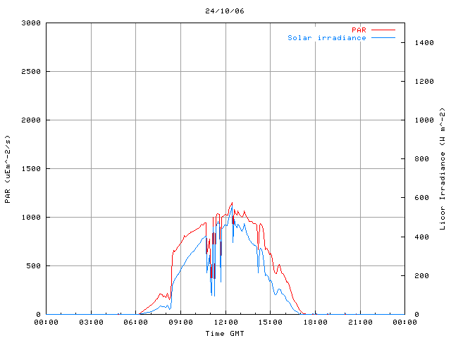 The PML meteorological station, situated on the south-west corner of the building roof, consists of a Hygroclip S3 temperature and humidity sensor housed in a radiation shield, a Mierij Meteo solid state wind sensor (MMW-005), a Chelsea instruments half-hemisphere PAR sensor, a Li-Cor pyranometer (LI-200SZ) and an Omni Instruments 6" tipping bucket raingauge (RG200). The data are logged every 5 minutes using a Pace Scientific XR5 data logger. The real-time rainfall data is likely in error - the correct values will be displayed after a time lag of approximately 24 hours. The meteorological station is sheltered from winds in the north-east and underestimates winds from this quarter. To use these data please contact Dr Tim Smyth.