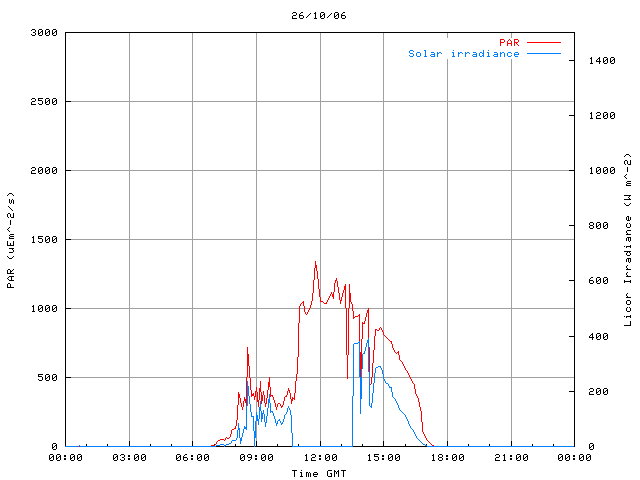 The PML meteorological station, situated on the south-west corner of the building roof, consists of a Hygroclip S3 temperature and humidity sensor housed in a radiation shield, a Mierij Meteo solid state wind sensor (MMW-005), a Chelsea instruments half-hemisphere PAR sensor, a Li-Cor pyranometer (LI-200SZ) and an Omni Instruments 6" tipping bucket raingauge (RG200). The data are logged every 5 minutes using a Pace Scientific XR5 data logger. The real-time rainfall data is likely in error - the correct values will be displayed after a time lag of approximately 24 hours. The meteorological station is sheltered from winds in the north-east and underestimates winds from this quarter. To use these data please contact Dr Tim Smyth.