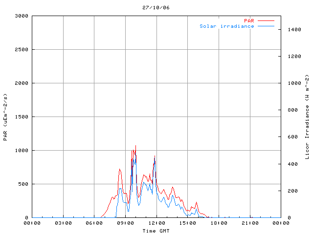 The PML meteorological station, situated on the south-west corner of the building roof, consists of a Hygroclip S3 temperature and humidity sensor housed in a radiation shield, a Mierij Meteo solid state wind sensor (MMW-005), a Chelsea instruments half-hemisphere PAR sensor, a Li-Cor pyranometer (LI-200SZ) and an Omni Instruments 6" tipping bucket raingauge (RG200). The data are logged every 5 minutes using a Pace Scientific XR5 data logger. The real-time rainfall data is likely in error - the correct values will be displayed after a time lag of approximately 24 hours. The meteorological station is sheltered from winds in the north-east and underestimates winds from this quarter. To use these data please contact Dr Tim Smyth.