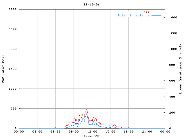 The PML meteorological station, situated on the south-west corner of the building roof, consists of a Hygroclip S3 temperature and humidity sensor housed in a radiation shield, a Mierij Meteo solid state wind sensor (MMW-005), a Chelsea instruments half-hemisphere PAR sensor, a Li-Cor pyranometer (LI-200SZ) and an Omni Instruments 6" tipping bucket raingauge (RG200). The data are logged every 5 minutes using a Pace Scientific XR5 data logger. The real-time rainfall data is likely in error - the correct values will be displayed after a time lag of approximately 24 hours. The meteorological station is sheltered from winds in the north-east and underestimates winds from this quarter. To use these data please contact Dr Tim Smyth.
