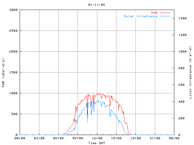 The PML meteorological station, situated on the south-west corner of the building roof, consists of a Hygroclip S3 temperature and humidity sensor housed in a radiation shield, a Mierij Meteo solid state wind sensor (MMW-005), a Chelsea instruments half-hemisphere PAR sensor, a Li-Cor pyranometer (LI-200SZ) and an Omni Instruments 6" tipping bucket raingauge (RG200). The data are logged every 5 minutes using a Pace Scientific XR5 data logger. The real-time rainfall data is likely in error - the correct values will be displayed after a time lag of approximately 24 hours. The meteorological station is sheltered from winds in the north-east and underestimates winds from this quarter. To use these data please contact Dr Tim Smyth.
