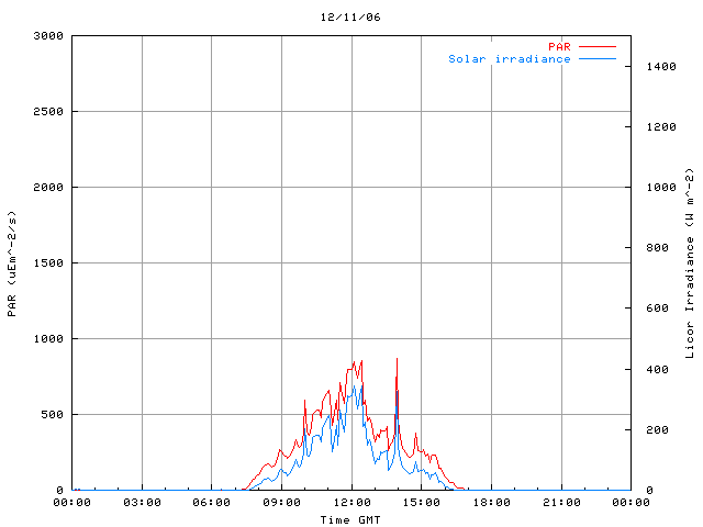 The PML meteorological station, situated on the south-west corner of the building roof, consists of a Hygroclip S3 temperature and humidity sensor housed in a radiation shield, a Mierij Meteo solid state wind sensor (MMW-005), a Chelsea instruments half-hemisphere PAR sensor, a Li-Cor pyranometer (LI-200SZ) and an Omni Instruments 6" tipping bucket raingauge (RG200). The data are logged every 5 minutes using a Pace Scientific XR5 data logger. The real-time rainfall data is likely in error - the correct values will be displayed after a time lag of approximately 24 hours. The meteorological station is sheltered from winds in the north-east and underestimates winds from this quarter. To use these data please contact Dr Tim Smyth.