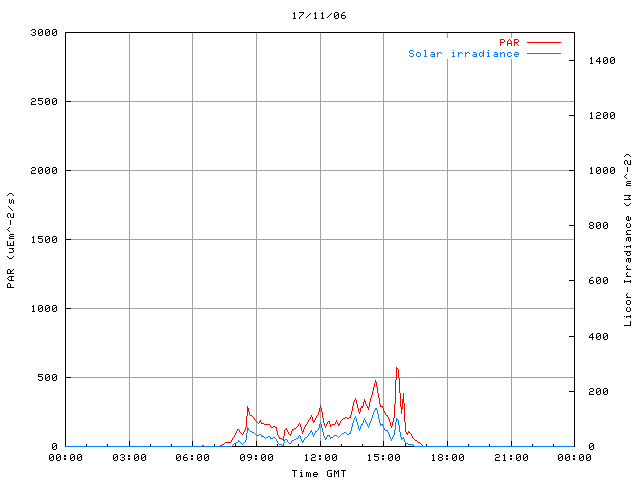 The PML meteorological station, situated on the south-west corner of the building roof, consists of a Hygroclip S3 temperature and humidity sensor housed in a radiation shield, a Mierij Meteo solid state wind sensor (MMW-005), a Chelsea instruments half-hemisphere PAR sensor, a Li-Cor pyranometer (LI-200SZ) and an Omni Instruments 6" tipping bucket raingauge (RG200). The data are logged every 5 minutes using a Pace Scientific XR5 data logger. The real-time rainfall data is likely in error - the correct values will be displayed after a time lag of approximately 24 hours. The meteorological station is sheltered from winds in the north-east and underestimates winds from this quarter. To use these data please contact Dr Tim Smyth.